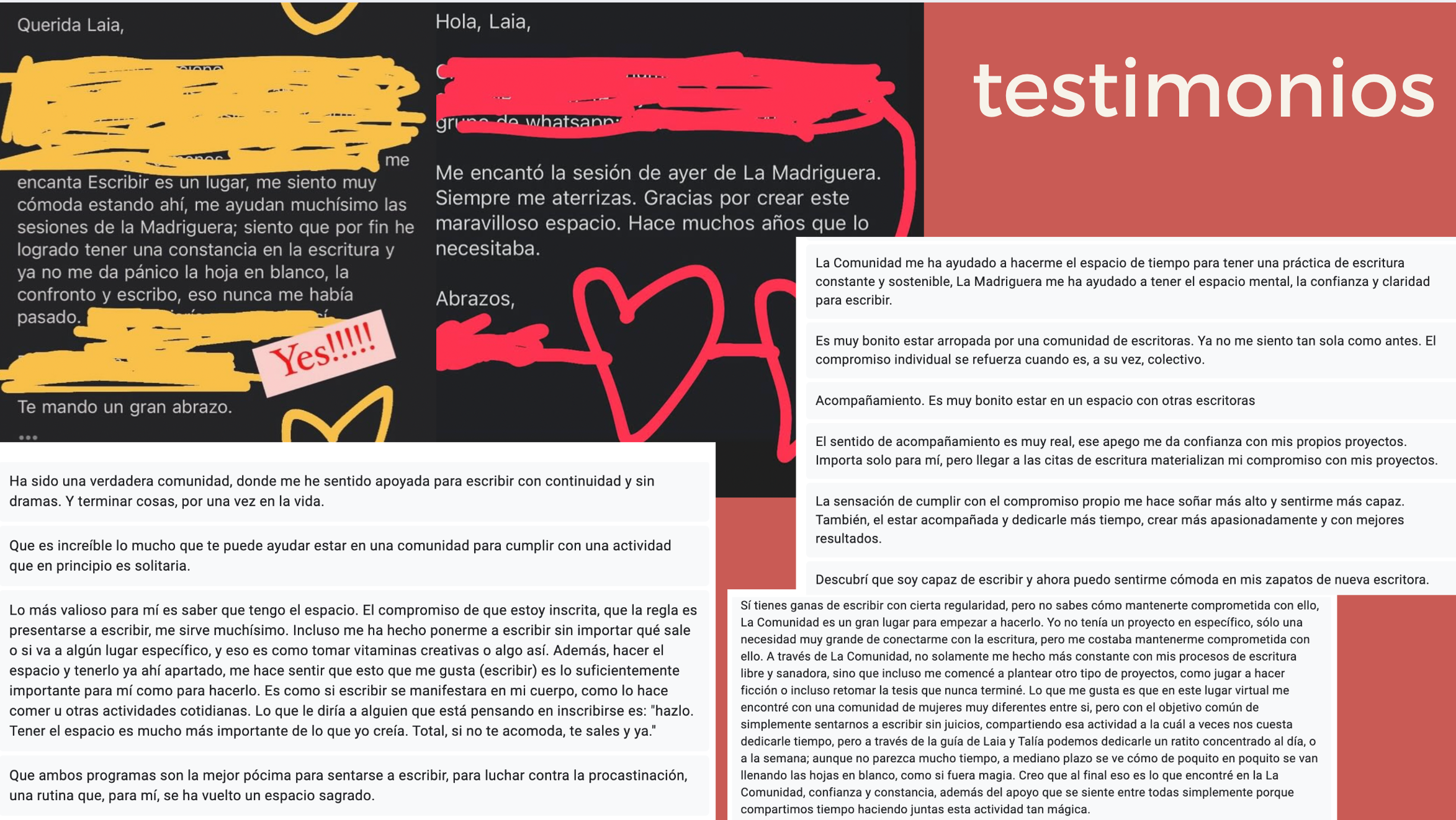 Este es el encuentro mensual donde nos juntamos a trabajar no en la escritura sino en la escritora. Utilizando herramientas del coaching (o recibiendo coaching de Laia directamente) exploramos un tema cada mes para revisar y actualizar nuestra relación con la escritura. Es donde hacemos comunidad. Son sesiones hermosas, conmovedoras y siempre sanadoras.